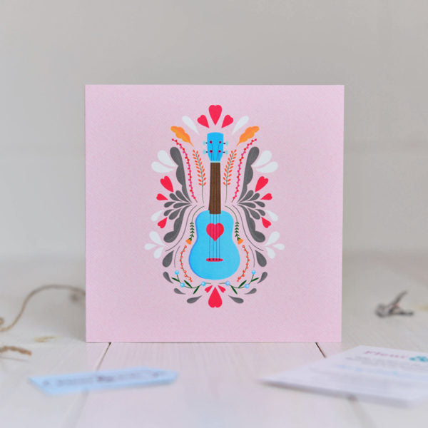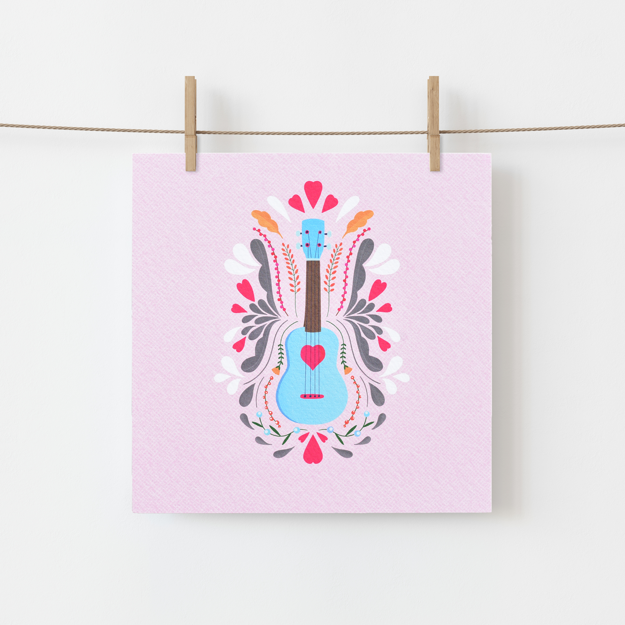 The sound coming from a Ukulele is always happy! I don’t think you can play a sad song on a Ukulele. I just had to use bright and cheerful colours for this. This illustration is one of a 4 part series