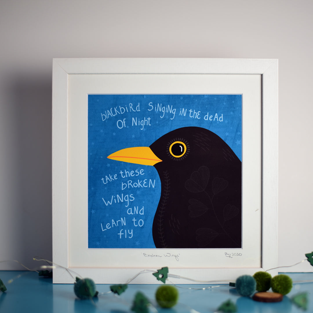 Broken Wings – an illustration of a blackbird with song lyrics by Paul McCartney