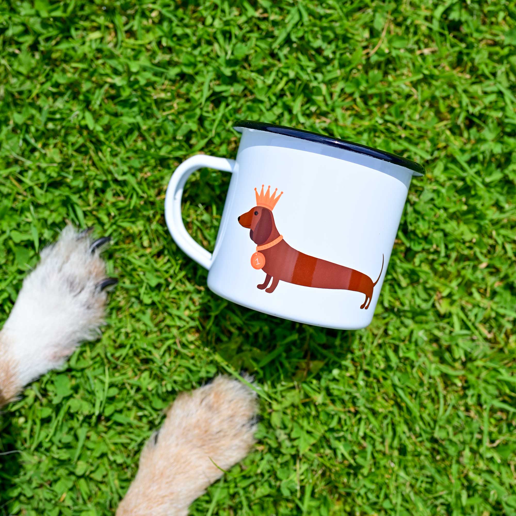 These vintage looking enamel mugs are just made for you to take them on your adventures or on a picnic. This mug features a cute dachshund both on the front and the back of the mug.