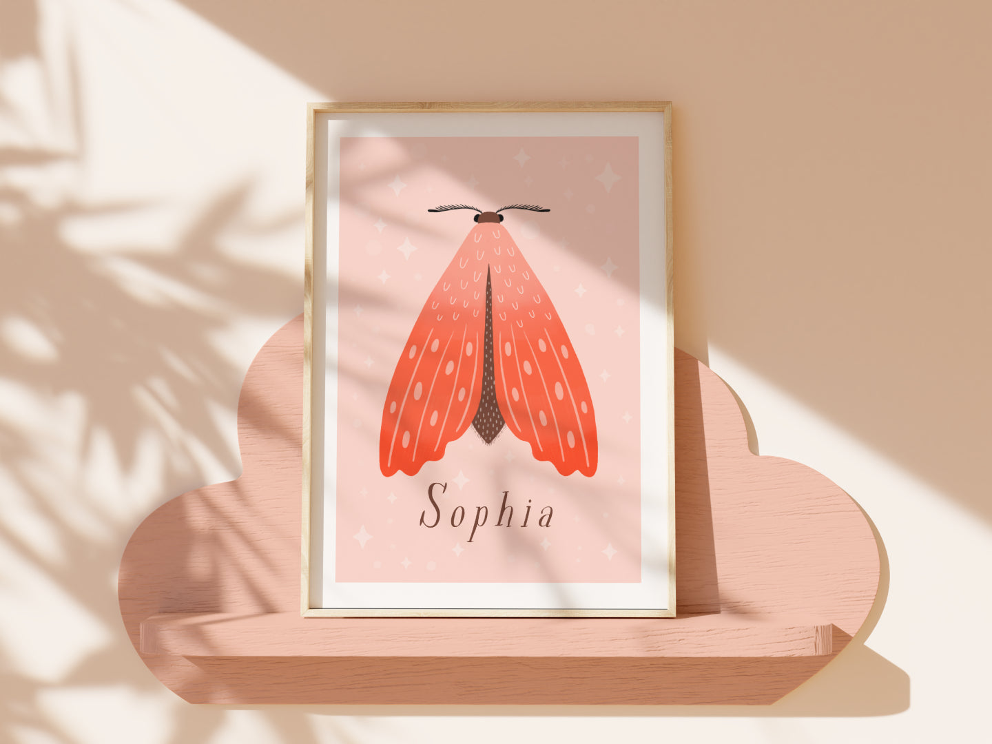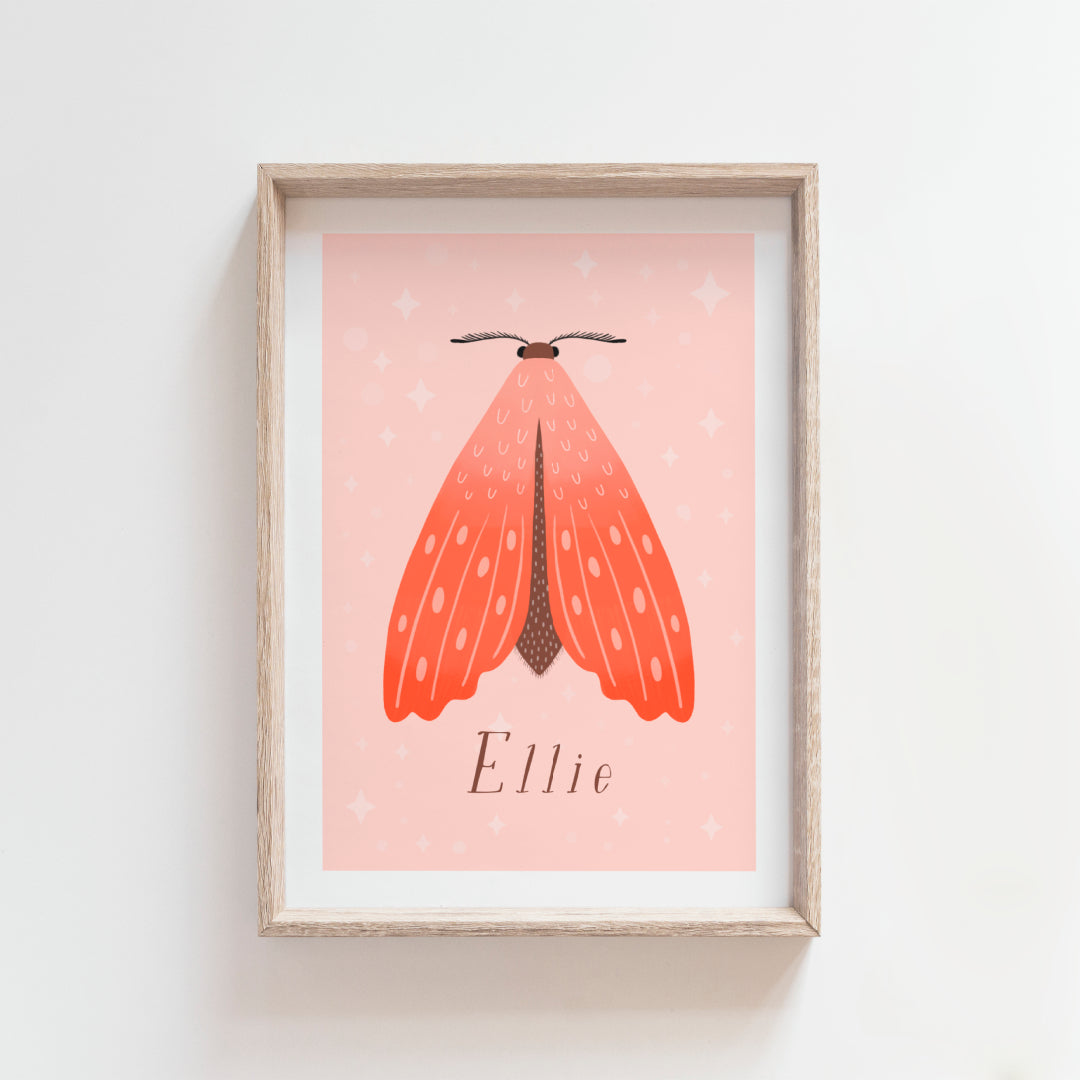 This enchanting print features a delicate moth with velvety wings, resting on a background of soft pink. The customizable name adds a personal touch, making it a truly special gift for a new arrival.